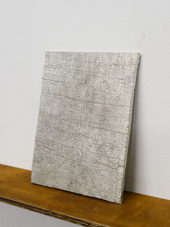 Dun vignettes in paint made from the floor; from the dust and debris; from the paper tails that curl from the hessian as it’s washed. These mottled scenes are in and of the studio. They, like the others, seem subject to the decay they in turn depict. Surfaces are scratched, scuffed and coarse, cracking along lines that otherwise meet. There’s something of the fugitive moment they emerged from captured in their ruin. It’s our turn to hold on to it.